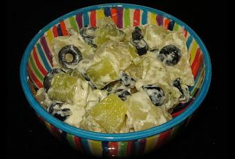 Cocemos dos patatas medianas, las dejamos enfriar y las pelamos. Le añadimos las aceitunas peladas, los pepinillos y la cebolla.