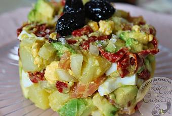 4 patatas grandes nuevas2 aguacates maduros½ cebolla6 huevos200 gramos de salmónOlivas negras (nosotros hemos usado del tipo muertas, pero usar el que más os guste)1 bote de pimientos de piquillo en tiras o bien 2 pimientos rojos asados2 dientes de ajoAceite de oliva virgen extraSal