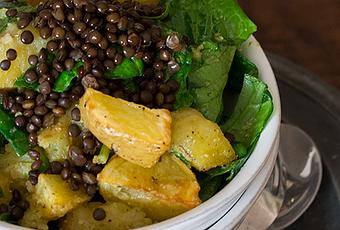 - Mientras lavamos, troceamos y secamos bien las espinacas. En un bote de cristal pequeño introducimos todos los ingredientes del aliño con un poco de sal y de pimienta, tapamos y agitamos bien hasta emulsionar. En una ensaladera grande, mezclamos las patatas calientes con las espinacas y el aliño. Una vez bien mezclado servimos con las lentejas decorando por encima.
