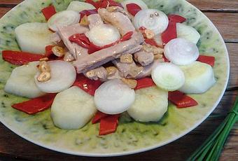 Ingredientes:4 patatasventresca de atún en aceite2 cebolletasuna lata de pimientos del piquillo2 dientes de ajo2 cucharadas de vinagre de vino4 cucharadas de aceitesal