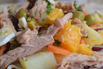 Pela y lava las patatas, ponlas en un recipiente apto para microondas previeamente troceadas en dados de unos dos centímetros. Añade sal. Introduce el recipiente tapado en el microondas con papel film o su tapadera. Programa 6 minutos , mñaxima potencia. remueve y programa de nuevo 3 minutos más a igual potencia. Saca a una ensaladera y reserva. Pela las zanahorias y corta en rodajas, enjuágalas. Pon sal y coloca en el mismo recipiente para el microondas que has utilizado anteriormente. Programa 3 minutos, máxima potencia. Añade a las patatas reservadas.Quita la piel a las naranjas, sin que quede nada de parte blanca y trocea. Incorpora a la ensalada junto con los huevos duros cortados en rodajas, los lomos de atún en aceite, la cebolla en juliana y las aceitunas verdes.