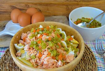 PREPARACION:Lavamos muy bien las patatas y las ponemos a cocer con la piel, en una olla con sal. En otra olla ponemos a cocer los huevos también con sal, para que luego se puedan pelar mejor.Cuando las patatas y los huevos estén cocidos, escurrimos y dejamos que se enfríen, luego pelamos y picamos los huevos y reservamos, lo mismo hacemos con las patatas, pelamos picamos y ponemos en un bol.Vamos hacer la vinagreta que es muy fácil, ponemos en un bol el encurtido con un poco de su jugo, un buen chorreón de aceite de oliva y mezclamos, como el encurtido ya lleva sal, no hace falta ponerle nada de sal.Encima de las patatas ponemos los huevos picados, el salmón natural en lata y la vinagreta que hemos hecho con el encurtido, mezclamos y ya podemos comer.