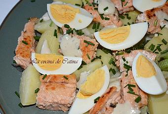 Una vez frías las patatas, añadimos la cebolleta bien picada, el salmón en trozos, las hierbas, los huevos duros cortados en mitades y lo regamos con la salsa a nuestro gusto, el resto de salsa, la reservamos directamente en la mesa y que cada comensal se sirva a su gusto.