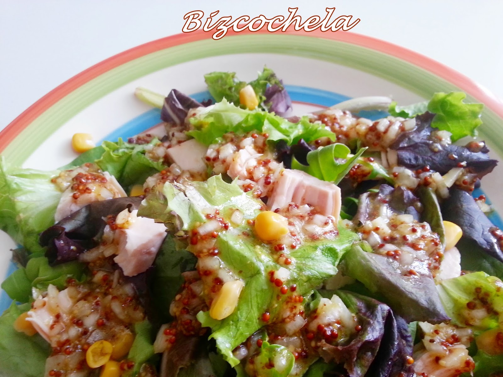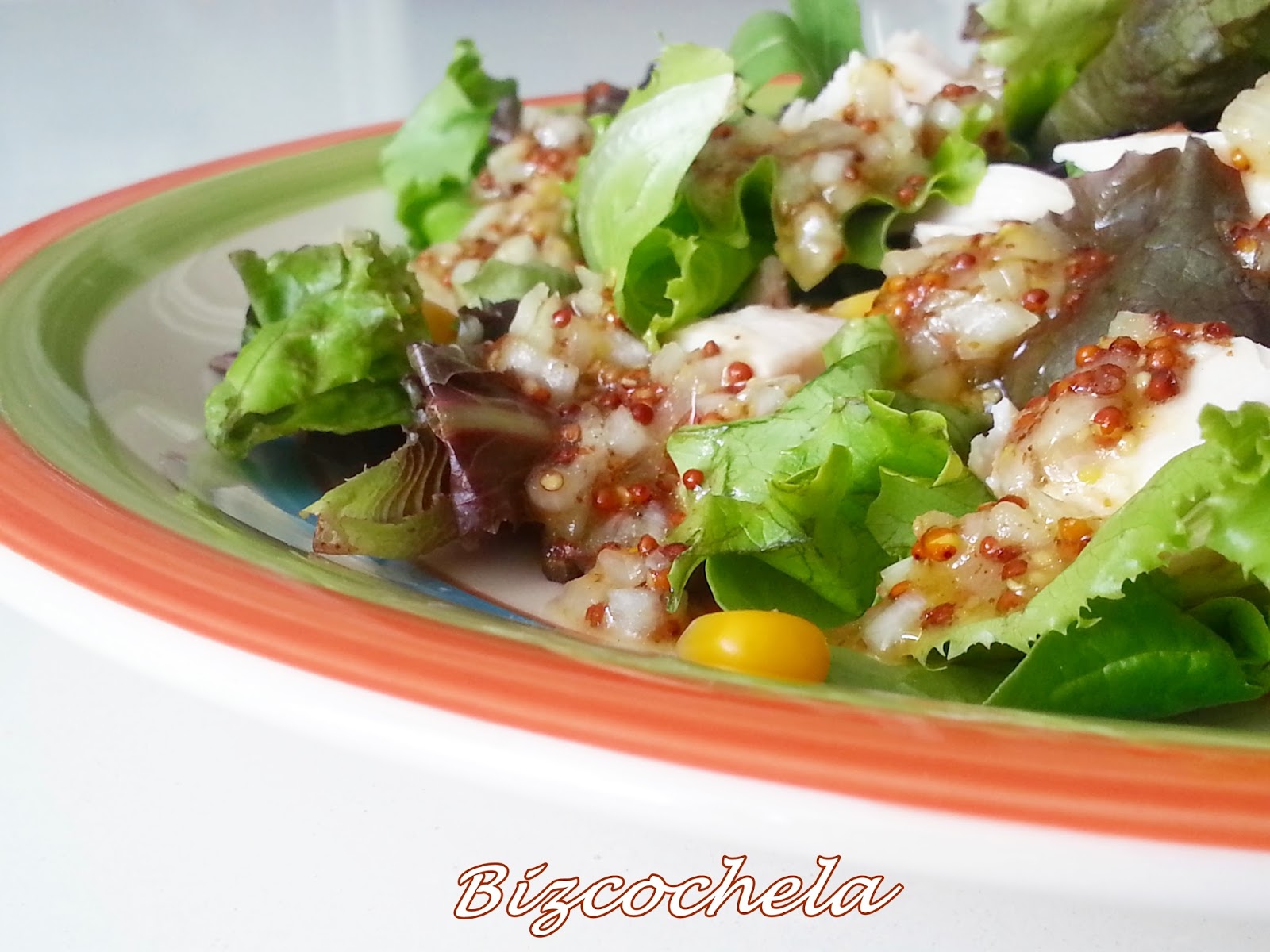 Lechuga (yo he utilizado una mezcla de lechugas)2 o tres cucharadas de maíz dulceUna cebolla pequeñaPechuga en escabeche2 cucharadas de miel2 cucharadas de mostaza antigua Aceite de oliva virgenSal