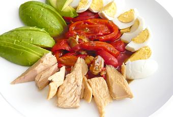- Tal y como veis en la foto, colocamos la ensalada de pimientos en el centro del plato y luego la completamos con lo que más nos guste. En este caso con aguacate, ventresca de atún y huevo cocido.