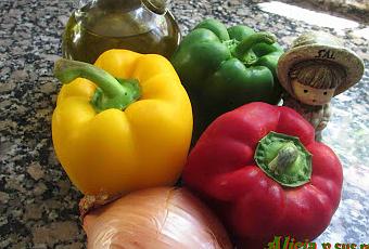 - Pimientos de asar: 1 verde, 1 rojo y 1 amarillo.- Cebollas 1 grande.- Aceite de oliva.- Sal.