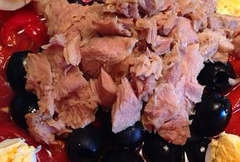 Un un plato grande ponemos los pimientos y el tomate añadimos el atún o bonito, el huevo cortado en gajos y las aceitunas. Regamos con un chorrito de AOVE y salamos con sal en escamas.