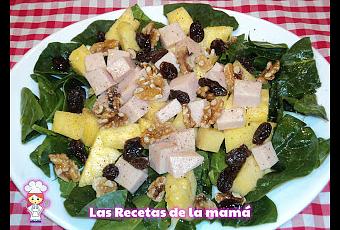 En una bandeja pones bajo las espinacas y por encima los trozos de piña, el fiambre de pavo troceado, las nueces y las pasas.