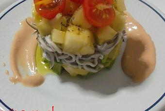 - Colocamos un aro de repostería en los platos y vamos rellenando con capas de aguacate, cangrejo, piña y tomate.