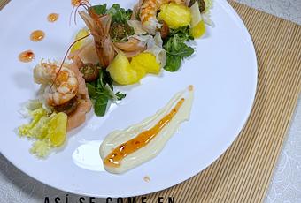 Lo mejor que tiene es la versatilidad que propone teniendo como base la rúcula, canónigos y algún tipo de lechuga al gusto, la piña como ingrediente principal y algo de marisco.Además de esto puede ser un plato único porque está bien surtido.Y es que en verano es lo que mas pide el cuerpo, sienta genial y es mejor que cada uno tenga su pato y no sea compartida porque aseguro que se acaba la conversación, en cuanto empiezas sigues como si no hubiera un mañana y ojo con que se acerquen a tu zona a comer... esa es la sensación que te da este plato, está tan rico que solo quieres esto y no quieres quedarte con hambre.No necesita un aliño especial ni una vinagreta complicada, en este caso hice una mayonesa de chile dulce, pero con un poco de aceite y el propio jugo de la piña es suficiente.No pongo cantidades porque depende de cada comensal añadir mas de uno que de otro.