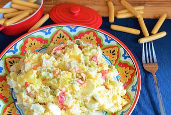 INGREDIENTES:- Una pechuga de pollo.- 4 o 5 patatas.- 3 huevos.- Zanahorias bote.- Guisantes bote.- Pimientos rojos asados.- Aceitunas sin hueso.- Mahonesa.- Sal.PREPARACION:Ponemos en ollas diferentes las patatas, los huevos y la pechuga de pollo con un poco de sal y dejamos que cada cosa se hagan a su ritmo.Cuando estén todos los ingredientes hechos, dejamos que se enfríen o se templen para pelar las patatas y los huevos para no quemarnos, luego troceamos las patatas, huevos y la pechuga pollo.En un bol grande ponemos todos los ingredientes troceados en trozos pequeños, añadimos la mahonesa y mezclamos muy bien, metemos en la nevera para que se enfríe hasta la hora de servir.