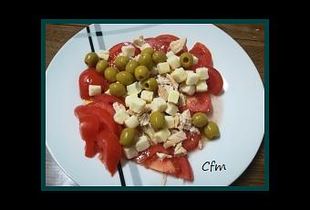 -2 tomates del país-1 pechuga de pollo asada y troceada-Queso de cabra en dados-Aceitunas verdes sin hueso-Aceite de oliva-Vinagre rojo-Sal