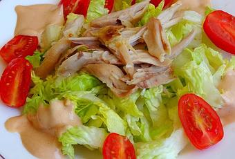 - En una bandeja, colocar en el fondo lechuga cortada en juliana, encima el pollo desmenuzado, añadir unos tomates cherry cortados por la mitad y huevo duro picado.