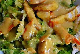 - Poner hojas de lechuga en el fondo del plato, encima tiras de pollo a la plancha y un buen chorro del aliño.