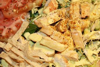 150 gr de lechugas variadas.1/2 tomate grande.2 pechugas de pollo (si es cortada en filetes, si es entera sólo una).2 rodajas de piña, quitandole la parte central que es dura o 2 rodajas de bote.Pan para ensaladas.