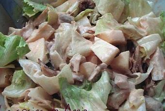 Cuando hice el pollo asado en la olla exprés, sobró media pechuga y me acordé de esta deliciosa ensalada que nos preparaba mi madre. Se la voy a dedicar a Nenalinda, que estuvo este verano en mi tierra, y tuvimos la oportunidad de conocernos y pasar un rato juntas (y me trajo un regalo precioso de su tierra!). Gracias, Nena, espero que te guste. Feliz fin de semana!- Mezclar 2 pechugas de pollo cocidas o asadas en trozos, con lechuga en juliana y dos manzanas golden troceadas. Servir con salsa rosa.