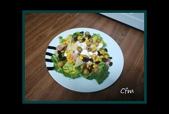 -Cogollos de Tudela-1 pehuga de pollo-Setas-1 tarrina pequeña de queso fresco-Maíz en grano-Aceitunas verdes sin hueso-Piña en su jugo-Pasas-Aceite de oliva-Vinagre rojo-Sal