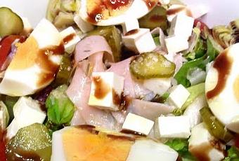 1/2 Lechuga Iceberg.12 Tomates Cherry.3 Huevos cocidos.6 Pepinillos Agridulces.6 Lonchas de Queso 0%6 Alcachofas hervidas.Vinagre de Modena.Aceite de Oliva Virgen.Sal.