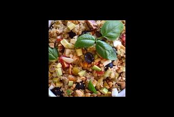 Lavamos la quinoa bajo el chorro de agua con ayuda de un colador, escurrimos y añadimos a un cazo y añadimos 1 vaso de agua por cada 2 de quinoa y sal. Ponemos a cocer a fuego medio hasta que se evapore el agua por completo, una vez lista retiramos y reservamos. Picamos la zanahoria, la berenjena, la chalota y el calabacín en daditos muy pequeños, los ponemos en una sartén con un chorrito de aceite, salpimentamos y dejamos sofreír a fuego medio suave durante 5 minutos o hasta que esté hecho, una vez listo lo añadiremos a la quinoa. Añadimos el pepino picado retirando la semilla central y tambien añadimos el resto de los ingredientes, queso fresco en dados, aceitunas, aguacate en dados, los anacardos, los tomates cherry en cuartos y la albahaca.