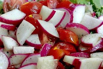 Ensalada muy buena y tan sencilla como os cuento:- Mezclar lechugas variadas, tomates cherry en cuartos, rabanitos lavados y cortados en rodajas, sal, pimienta negra y aceite de oliva virgen.