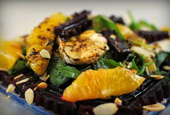 4 remolachas grandes sin pelar.125 gramos de brotes de espinaca y rúcula.Hojitas de menta fresca.2 naranjas peladas cortadas en gajos.Una bola de queso mozzarella de búfala o queso de cabra.50 gramos de almendras peladas, tostadas y troceadas.