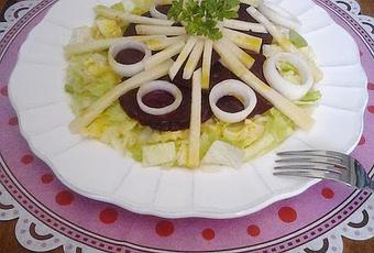 Lavar y cortar la lechuga en juliana fina.Pelar y cortar la remolacha en rodajas, las cebollas las cortamos en aros y el queso en tiras finas como muestra la foto.En un bol, ponemos el aceite, el vinagre, la mostaza y la sal y vamos removiendo hasta que se integren todos los ingredientes.En el plato o la fuente donde se vaya a servir, ponemos una capa de lechuga en el fondo