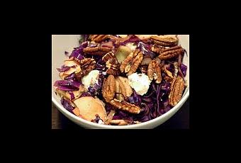 Cortar en juliana fina (tiritas bien finas; necesitarán un cuchillo bien afilado) 1/2 repollo blanco y 1/2 repollo morado. Colocar en un bols con un puñadito de sal y abundante agua. Dejar ablandar unos minutos. Colar, enjuagar y reservar. En un bols, colocar 1 cebolla cortada en pluma (bien finita), agregar agua caliente y dejar curar durante unos minutos. Luego, enjuagar con agua fría y colocar en un bols con cubos de hielo (esto hará que la cebolla quede crujiente). Reservar. Cortar 2 manzanas verdes en cubitos y rociar con jugo de limón. Reservar. En una ensaladera mezclar el repollo con la manzana. Incorporar 1/2 taza de queso azul en trozos (cortar con las manos, irregulares). Agregar 1/2 taza de nueces (opcional). Mezclar los ingredientes. Aparte, preparar el aderezo mezclando 2 cucharadas de vinagre de manzana, 1 taza de mayonesa, 1/2 taza de queso crema, la pizca de azúcar y la pimienta. Emulsionar. Aderezar la ensalada y mezclar bien.