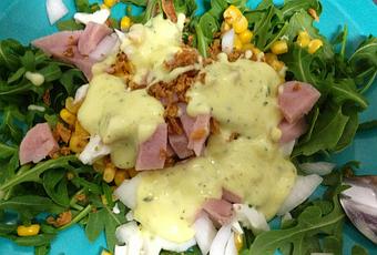 Hoy llegué a casa y decidí hacerme una ensalada de rúcula , una cena sana y además hice una salsa de yogurt natural más sana , de dieta y sin conservantes. La cena la tenía echa en diez minutos. En la ensalada de rúcula puse:- Rúcula- Cebolla- Cebolla caramelizada- Jamón de pavo- Maíz- Queso fresco desnatado