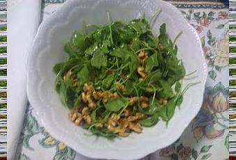 Este invierno estuve en Alemania y la tía de nuestra amiga nos preparó una ensalada muy verde, con nueces y hojas de una planta desconocida por nosotras. Le preguntamos a nuestra amiga qué planta era, pero no nos supo decir su nombre en castellano. Ahora que me tengo que buscar la vida para comer, me acordé de esta ensalada que tanto me gustó en su día, así que busqué su receta en internet. Averigüé que la planta es rúcula, y así pude comprar los ingredientes, pero en Oviedo, que en mi pueblo la rúcula no se vende. Me la hice y la verdad, me salió muy bien, porque me gustó, no tanto como la primera vez, pero esque esta vez comí más cantidad y yo me suelo cansar enseguida de comer lo mismo.Receta: