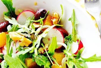 En una fuente de servir colocar la rúcula, los rábanos lavados y cortados a rodajas, las aceitunas negras, las nueces troceadas y los trozos de naranja.