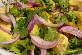 Disponemos la rúcula en una fuente, por encima ponemos el mango en trozos y el aguacate cortado en gajos. Añadimos la cebolla en juliana y picamos por encima el cilantro. Salseamos con la vinagreta y listo.