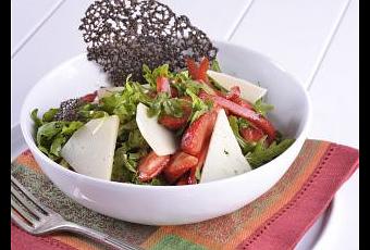 Luego, preparamos una vinagreta con el aceite, el vinagre y sal. Condimentamos la rúcula con los pimientos y las frutillas con esta vinagreta.