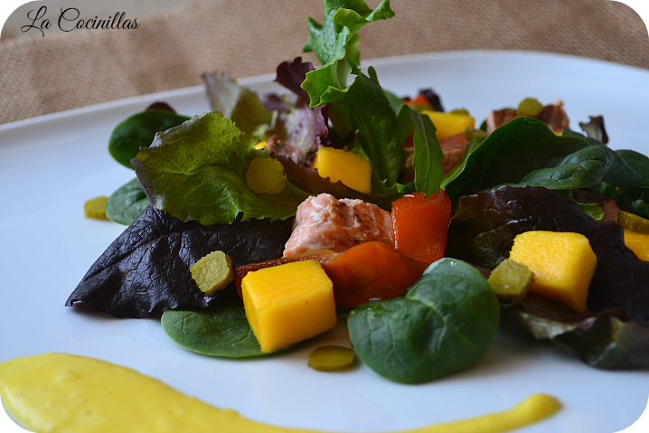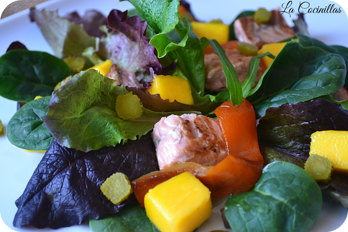 Hoy os propongo una ensalada rica y refrescante para estos días tan calurosos, además es sencilla de preparar y muy completa ya que el salmón que lleva como ingrediente aporta las raciones de proteínas necesarias, además de grasas saludables como es el omega 3 que ayudan a prevenir las enfermedades cardiovasculares, el mango aporta la porción de fruta y la lechuga y los pimientos la porción de verduras, ya solo quedara completarla con algo de hidratos de carbono de absorción lenta ( arroz, pasta, patatas..), una receta muy adecuada para estos días en los que solo nos apetece comer poquito y fresco pero sin renunciar a los nutrientes que necesitamos diariamente. Una ensalada diferente ya que el contraste del mango con el Salmon es espectacular, os animo a probarla y a que me digáis que os ha parecido, a mi me ha encantado. INGREDIENTES ( para 4 personas ):- 300 g de salmón fresco en un trozo.- 100 g de mezcla de lechugas.- 2 pimientos rojos.- 2 cucharadas de pepinillos en vinagre.-2 cucharadas de alcaparras.- Aceite de oliva.-Sal.- Pimienta negra molida. Para la vinagreta de mango:- 1 mango.- 100 ml de aceite de oliva.- 2 cucharadas de zumo de limón.- pimienta negra molida.- sal.
