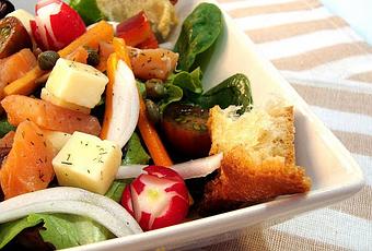 Un paquete de salmón y queso cremoso marinado (de Mercadona) *Cebolla de verdeoPimiento rojo dulceTomates SherryRabanitos miniAlcaparrasAjoUn paquete de brotes verdesPan de rosca gallega (o chapata)Aceite de oliva Agua mineralVinagre de manzana (o suave)Sal