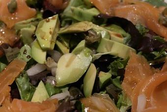 Picamos el salmón y lo colocamos alrededor de la ensalada.