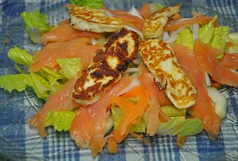Halloumi es un queso originario de Chipre. Tradicionalmente se elabora con una mezcla de leche de cabra y oveja, aunque se pueden encontrar halloumi elaborados con leche de vaca. El halloumi elaborado de forma industrial tiene más leche de vaca que leche de cabra y oveja. Este cambio en la proporción reduce el coste pero cambia el sabor, además de sus propiedades al ponerse a la parrilla. Buenísimo. Ensalada De Salmón Y Halloumi