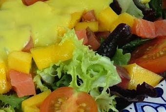 - Poner en la ensaladera lechugas variadas y troceadas, con sal y un chorrito de aceite, salmón ahumado en tiras o taquitos, el resto del mango a trocitos, y el aliño reservado.