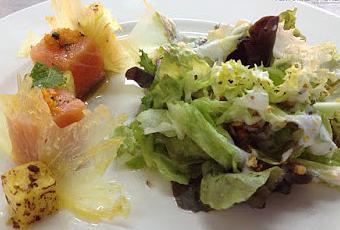 Poner los dados de salmón y de la piña en línea recta y entre ella colocar el crujiente de piña, al lado poner la mezclum aliñada con la salsa de yogurt.