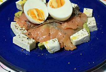 Queso fresco: 200 gramos.Salmón marinado: 200 gramos.Aguacate: dos.Anchoas en aceite: 16.Huevo: 4.Vinagre.Pimienta negra.