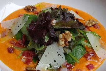 Antes de que termine el verano, quiero enseñaros esta rica ensalada que me ha enseñado mi sobrina. Una ensalada diferente y llena de sabor. Gracias, María! - Poner en el fondo de cada cuenco el salmorejo, encima mezcla de lechugas, daditos o lonchas de jamón serrano (o de pato), nueces u otros frutos secos, virutas de queso y bolitas de paté (opcional).