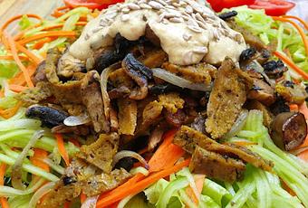 - Montamos la ensalada colocando la lechuga, la zanahoria y el pepino en una ensaladera. Encima colocamos el salteado de seitán, las rodajas de tomate y servimos con la salsa y las pipas de girasol por encima.