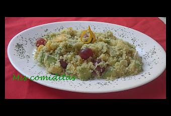 Mezclamos la fruta con el cuscús y la hierbabuena o menta bien picadita.