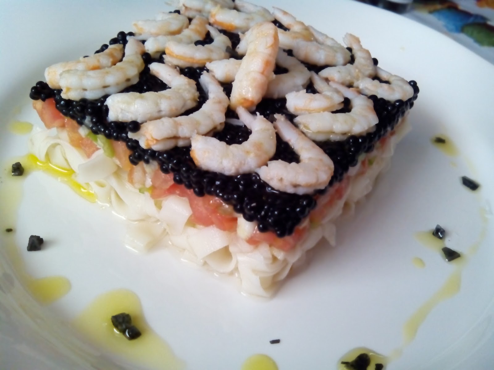 Se utiliza un molde cuadrado de 10x10 y lo rellanamos con una primera capa de tagliatelle, se sigue con otra capa de pipirrana, terminar con una última capa de huevas de lumpo y decorar con las gambas, chorro de aove y la sal negra en pirámide.