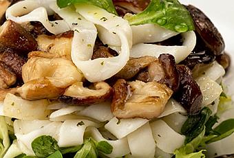 - En esa misma sartén con otro chorrito de aceite freimos el ajo y los tallarines a la vez. Una vez listos los mezclamos con las setas y preparamos para emplatar.