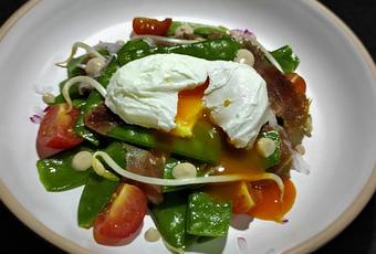4. Montamos la ensalada templada de tirabeques y jamón en plato hondo o cuenco, con las vainas y las hortalizas como base. Coronamos con el huevo que hemos escalfado y servimos.