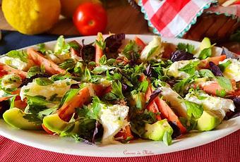 - Rompemos la mozarela en trocitos y los incorporamos a la ensalada. Colocamos por encima las hojas de albahaca y las del perejil. Salpimentamos, aliñamos con e aceite de oliva, y ensalada lista para servir. ¡buenísima!
