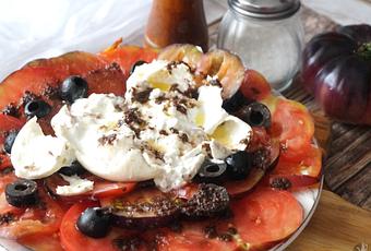 Yo os traigo una de mis ensaladas favoritas, de tomate con burrata, la acompaño de una vinagreta con olivada de aceitunas negras. La combinación de sabores es una maravilla.