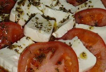 En un cuenco pequeño ponemos un poco de aceite y echamos una cucharadita de moka de orégano seco y sal. Movemos bien con una cucharilla y lo dejamos un rato macerar. A la hora de tomar la ensalada cortamos el tomate en rodajas muy finas y el queso también en lonchas. En cada plato alternamos rodajas de tomate y de queso y vertemos por encima el macerado de aceite con orégano que teníamos macerando.