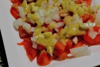 Ingredientes: 2 tomates grandes; 1 cebolla grande; 6 cucharadas AOVE; 4 cucharadas vinagre; 1 cucharadita mostaza Dijon; sal; pimiemta.