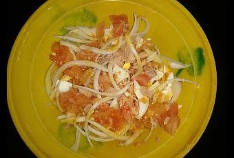 Lo que más llama la atención de esta receta es como nuestra amiga Eva trata la cebolla; la corta en láminas y la coloca en un escurridos con tres cucharadas de sal y esperamos a que se reblandezca mientras preparamos el resto de los ingredientes.